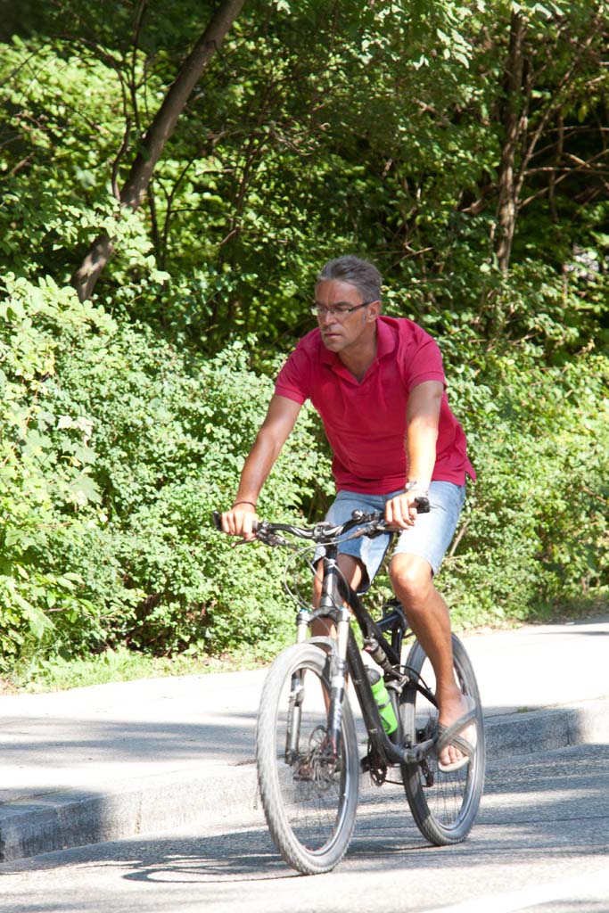 In any case I have chosen a very safe subject and environment in which to shoot. Opposite Munich's largest park is a large road intersection offering good sight lines and room to move around. Across this junction come many cyclists on their way into the park and perhaps a cold beer or two. I decided to try and capture a few different styles of cyclists as they buzzed past or stopped to wait for the lights. I have used a 70-200mm f/4 zoom lens for this exercise, lighter than my other image stablized f/2.8 70-200. This lens is part of my travel kit, light and yet offering excellent quality. The absence of IS is not an issue when shooting moving subjects as I need a high shutter speed in any case. On some of the following shots I have also added a 1.4x extender for a little extra reach.